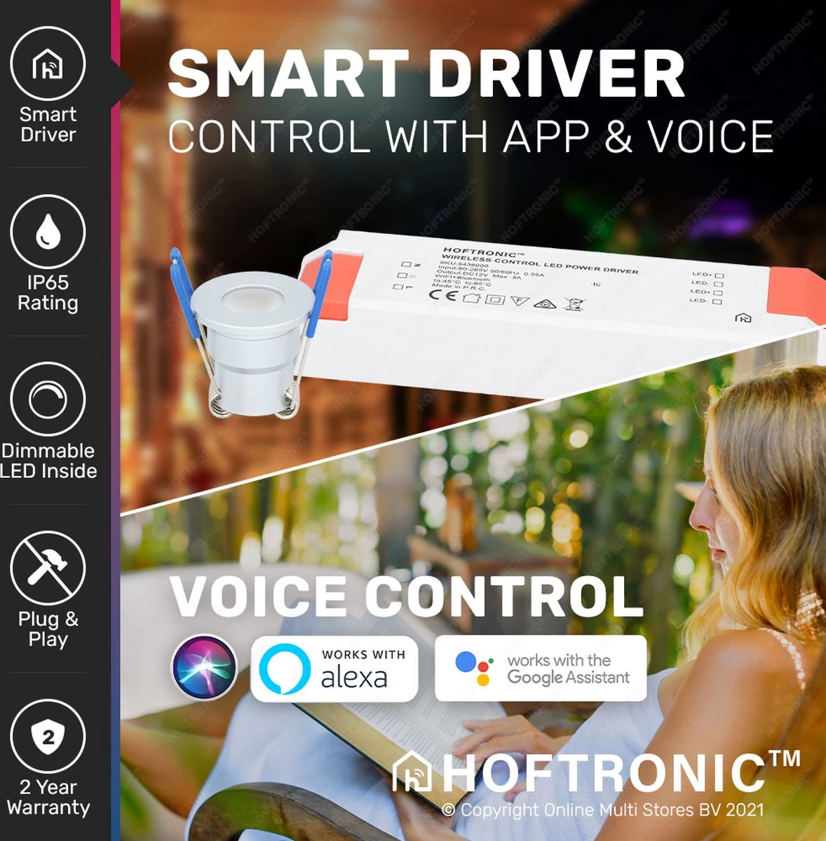 - Smart assistent: Via de gratis Hoftronic Smart app koppel je deze spotjes razendsnel aan je slimme assistent. Zo bedien je de inbouwspots met je stem: “Oké Google, zet de verlichting in mijn veranda aan”. Ondersteunde slimme assistenten zijn: Google Home, Amazon Alexa en Siri