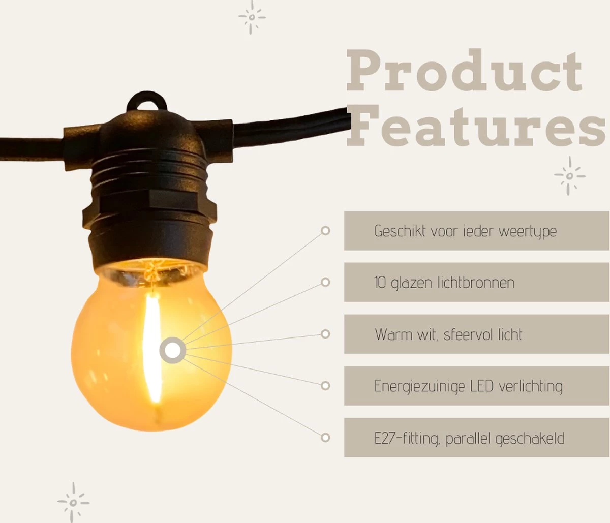 Met een lengte van 10 meter, voorziet het lichtsnoer een groot oppervlak van sfeervolle verlichting. De lichtbronnen zijn 100% LED, wat beter is voor het milieu en zorgt voor een lange levensduur. Bespaar op energiekosten dankzij deze verlichting met een groen karakter.