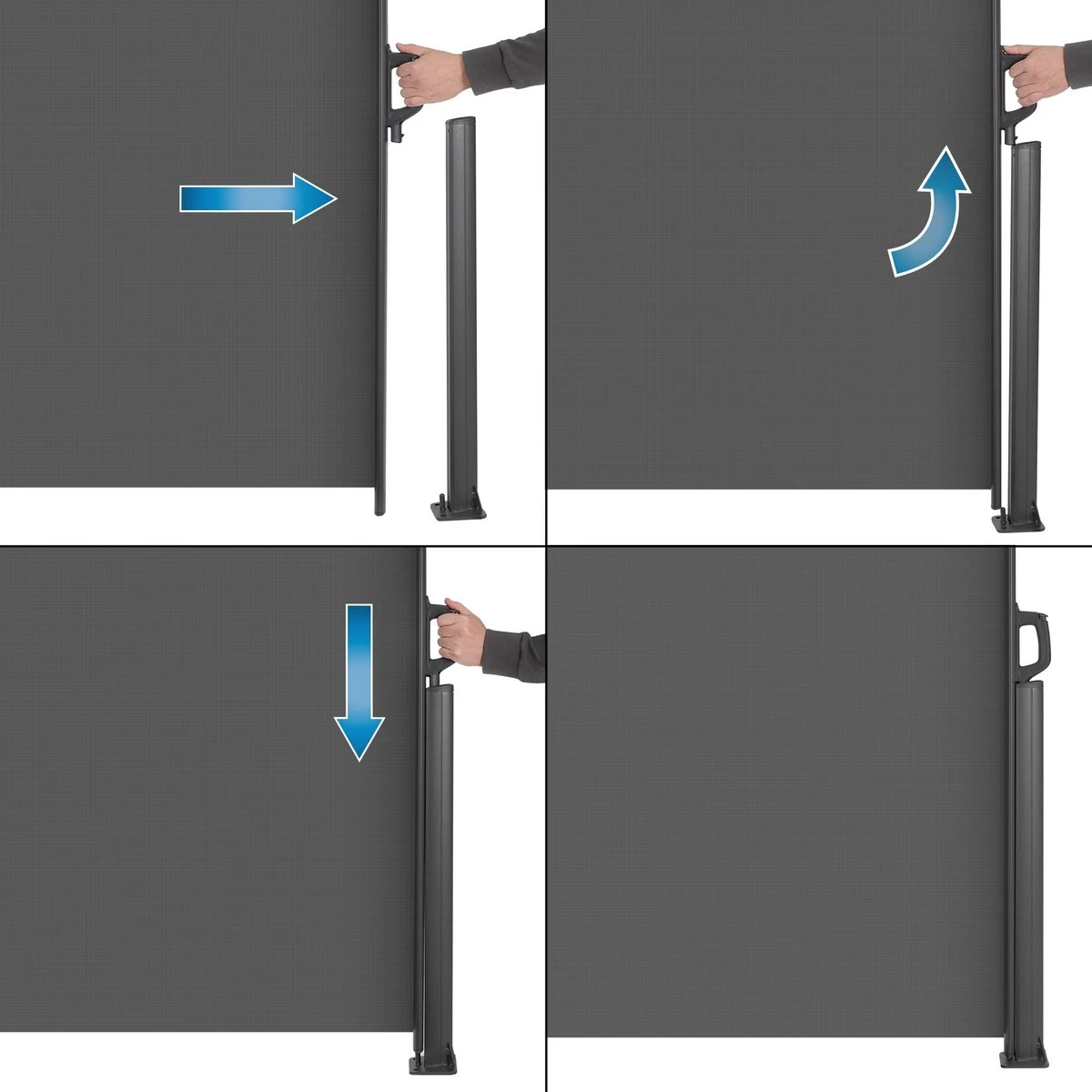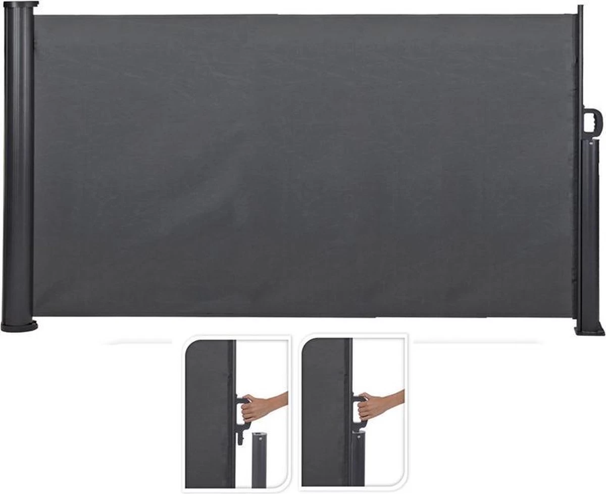 Dit oprolbare terrasscherm biedt je privacy en bescherming tegen de wind. Het frame is van aluminium en het polyester doek is voorzien van een waterafstotende coating. De wandcassette heeft een stevig veersysteem zodat het windscherm automatsich oprolt. Het windscherm is uitrolbaar tot max. 300 cm, de hoogte is 160 cm.
