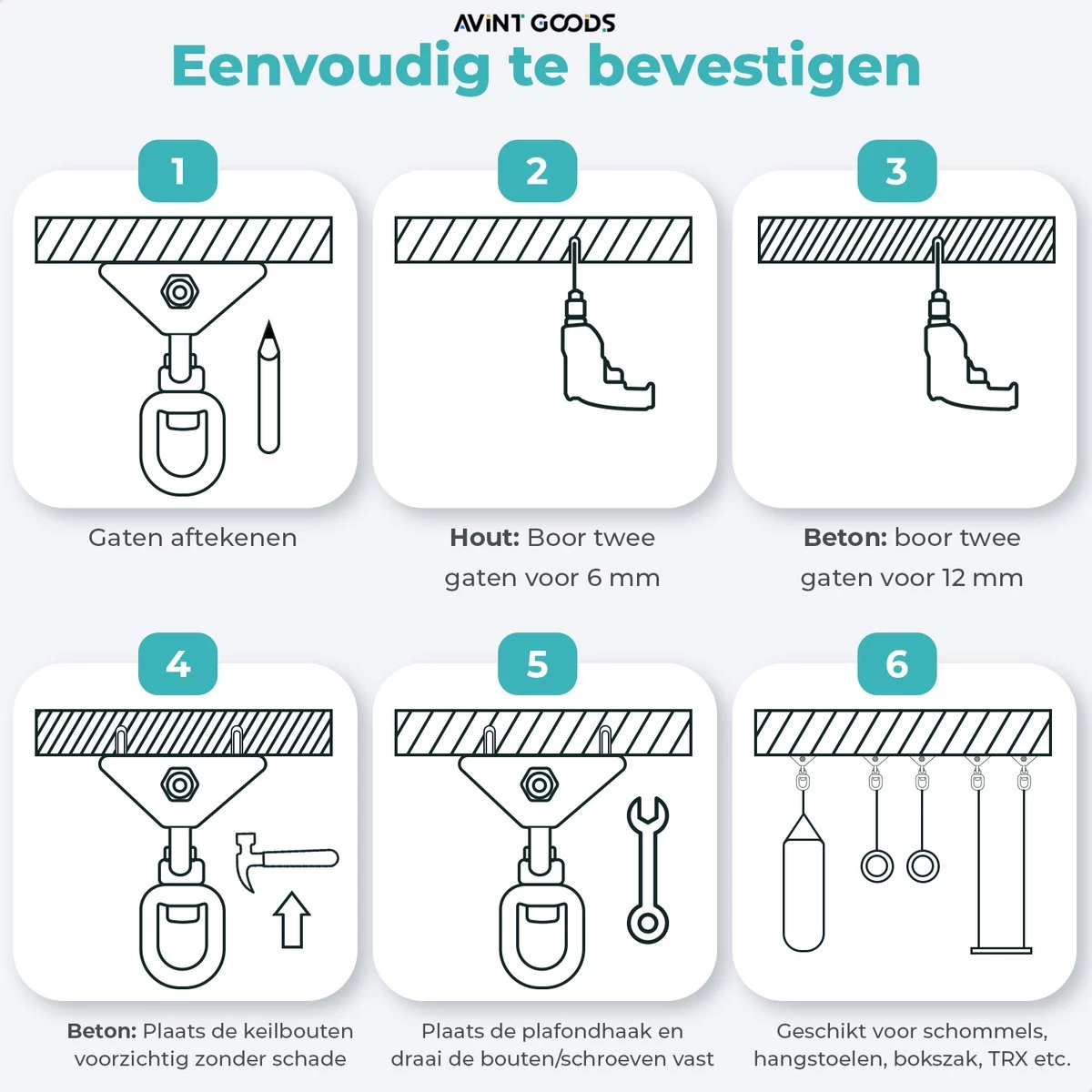 Een multifunctioneel ophangsysteem voor het plafond? Met de AVINT GOODS plafondhaak hang jij de zwaarste spullen veilig op. Of je nou voor een schommel, TRX-trainer of hangmat gaat, ons ophangsysteem kan alles aan!