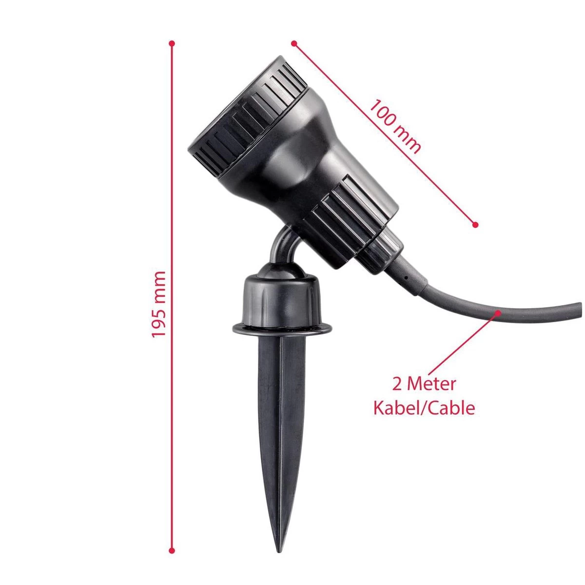 Beschermingsklasse IP44 – spatwaterdicht. Insteekbare kabel – 2 meter + 0,9 m elk naar de radiator. Inclusief wandhouder en grondspike. Draaibaar spots.