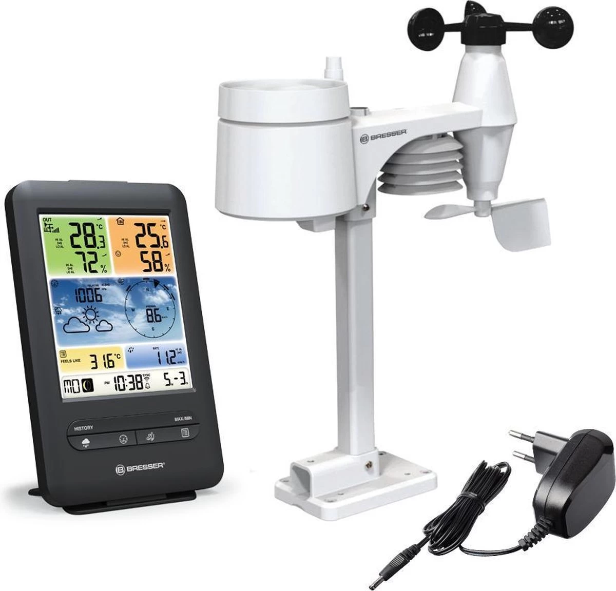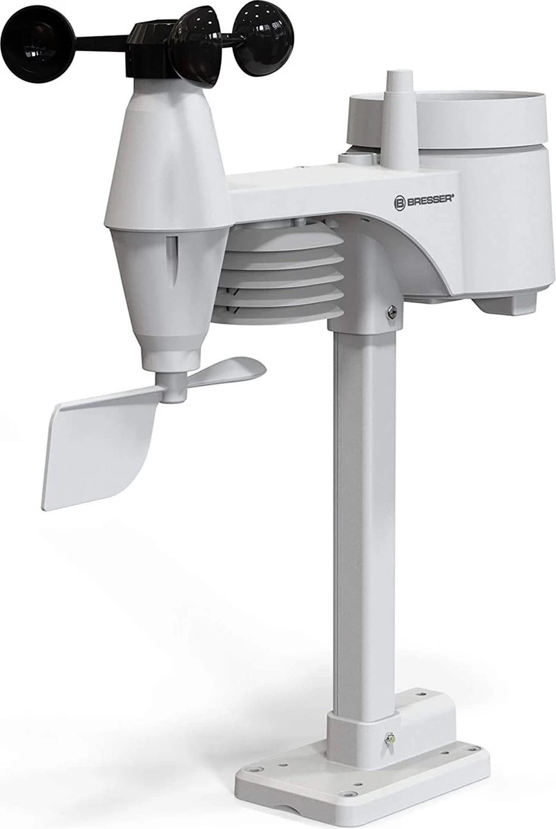 Het Bresser WLAN Colour Weather Center met professionele 5-in-1 sensor V biedt, ondanks het compacte ontwerp, een uitgebreid scala aan informatie. De multifunctionele professionele buitensensor kan eenvoudig worden gemonteerd met de meegeleverde montageaccessoires. De professionele buitensensor zendt op betrouwbare wijze meetwaarden voor windsnelheid, windrichting, luchtvochtigheid, temperatuur en neerslag via een 868 MHz-frequentie naar het basisstation.