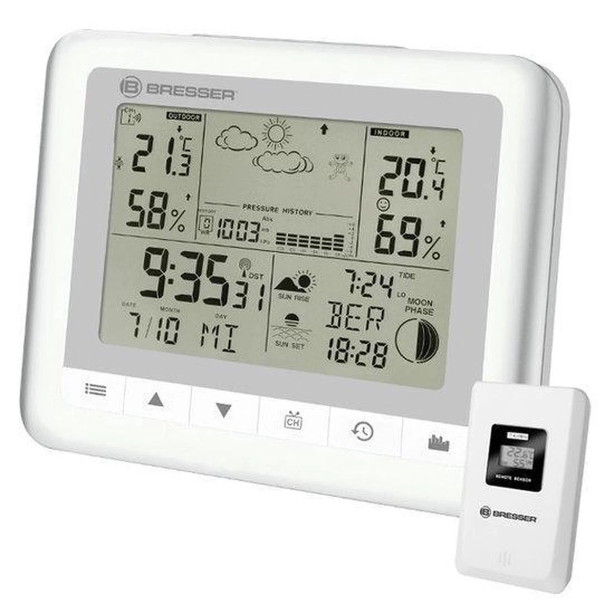 Naast de temperatuur- en luchtvochtigheidsweergave voor binnen en buiten geeft dit weerstation ook de actuele weerssituatie, weertrends en maanstanden weer. Dankzij de indeling van het Lcd-display in vijf gedeeltes heb je altijd een overzichtelijke weergave van je huidige weersomstandigheden.