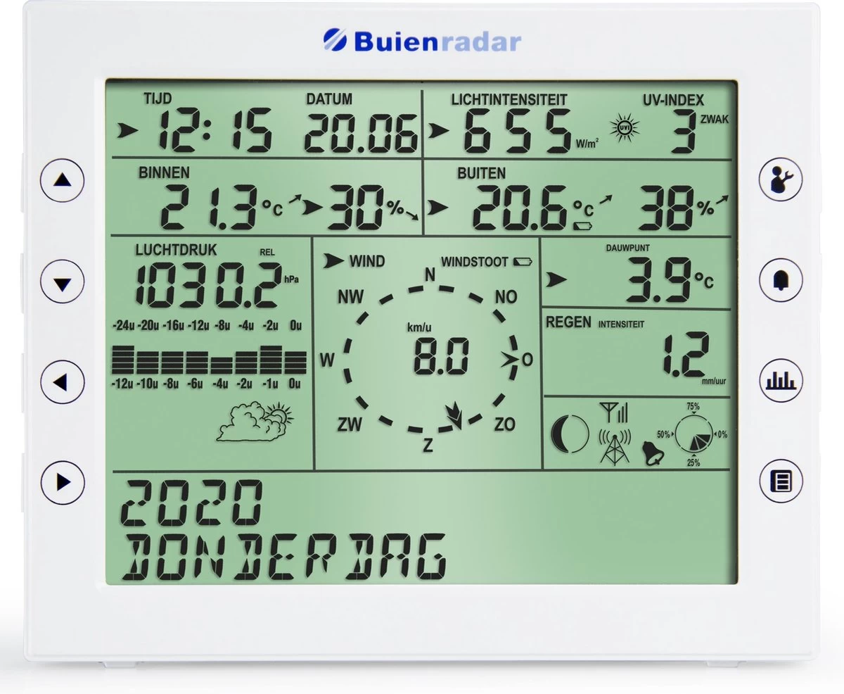 De draadloze buitenunit is compleet: hij komt met een regenmeter, windsnelheidsmeter, windrichtingsensor, temperatuursensor en vochtigheidssensor. De buienmast wordt gevoed door een zonnepaneel. Dat is niet alleen duurzaam maar goedkoop bovendien. Alle data over de actuele neerslag, temperatuur, luchtvochtigheid en wind worden draadloos verzonden naar het prachtige grote scherm, en op een geanimeerde manier in beeld gebracht. Zo weet je altijd precies hoe de situatie buiten is. Daarnaast vertelt dit thuis weerstation je ook hoe het met de temperatuur Ãn huis is gesteld. Ook deze data wordt draadloos naar je display verzonden.