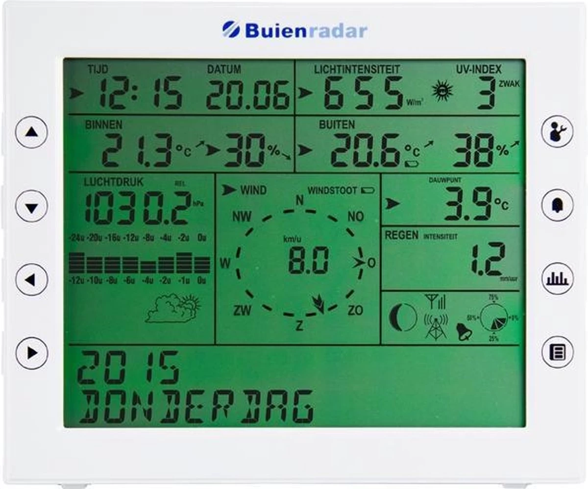 Met het BR-1800 thuis weerstation van Buienradar wordt professionele weermeting voor elke weerenthousiateling mogelijk. Hij bestaat uit een mast met verschillende sensoren voor buiten (de buitenunit) en een prachtig meetdisplay voor binnen.