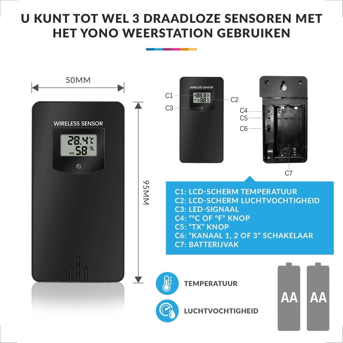 De bijbehorende buitensensor wordt exclusief weerstation meegeleverd. Als u meerdere buiten sensoren wilt aanschaffen is dit mogelijk, het YONO weerstation kan maximaal 3 sensoren weegeven op drie verschillende kanalen. Deze sensoren kunt u koppelen op 3 verschillende kanalen zodat u deze kunt aflezen op het weerstation. Als u het weerstation wilt aanschaffen kunt u zoeken op het volgende “YONO Weerstation Binnen en Buiten”.