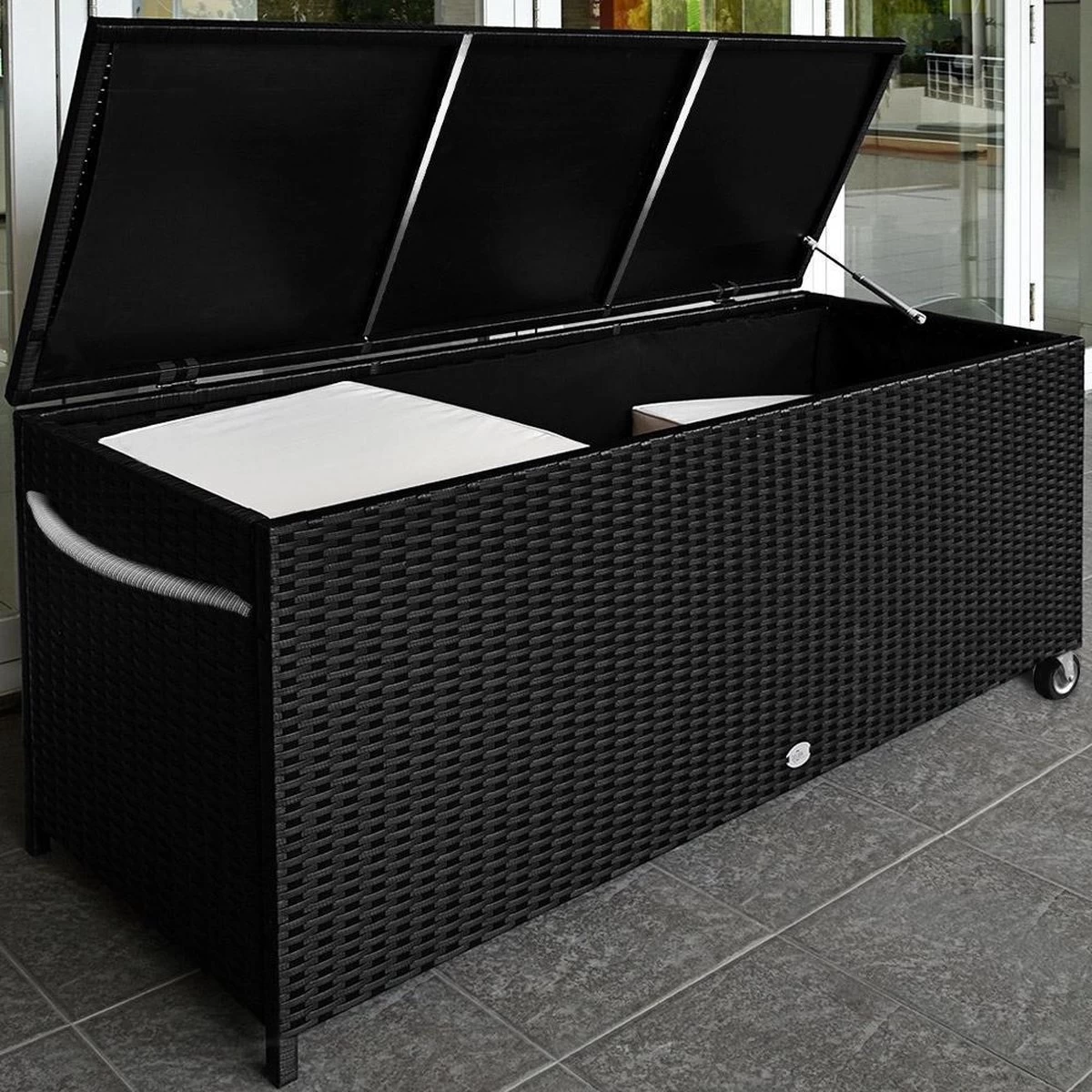 De robuuste kussenbox van onderhoudsvriendelijk polyrattan biedt voldoende ruimte voor zitkussens, kussens en andere tuinaccessoires. Dankzij de wielen en de handgreep is de kussenbox gemakkelijk te verplaatsen.