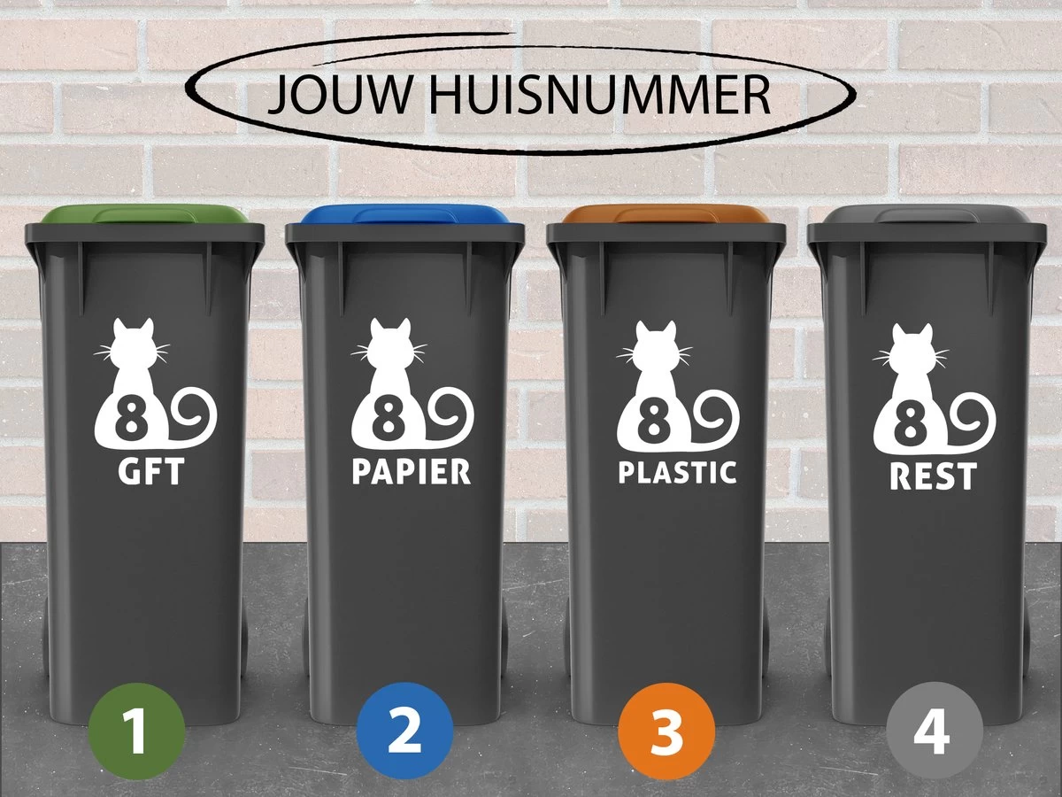 Container Stickers – Voordeelset 4 Stuks – 15×20 Cm – Container / Kliko Sticker Huisnummer – Afvalcontainer Sticker – Klikosticker – Kat / Poes Met Huisnummer En Tekst: Plastic, Papier, GFT En Restafval