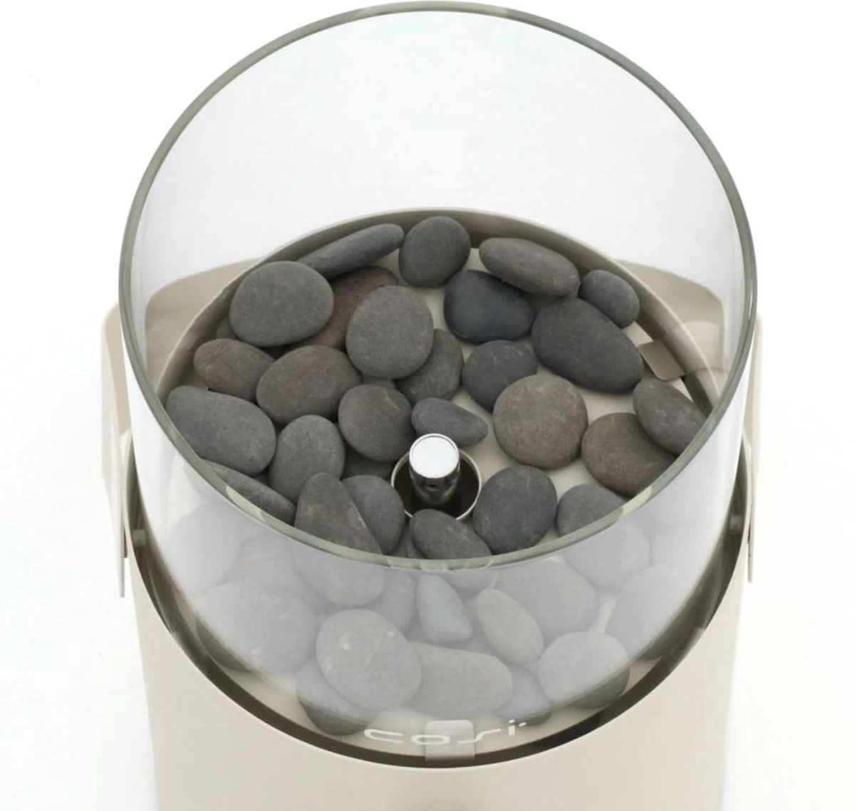 De Cosiscoop Original wordt geleverd inclusief glas en kiezelstenen. Universele 190 gram gascartouches met veiligheidsventiel zijn te verkrijgen bij onze Cosi partners, tuincentra en bouwmarkten.