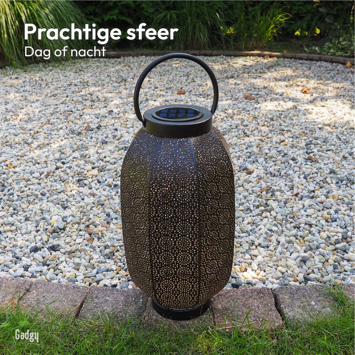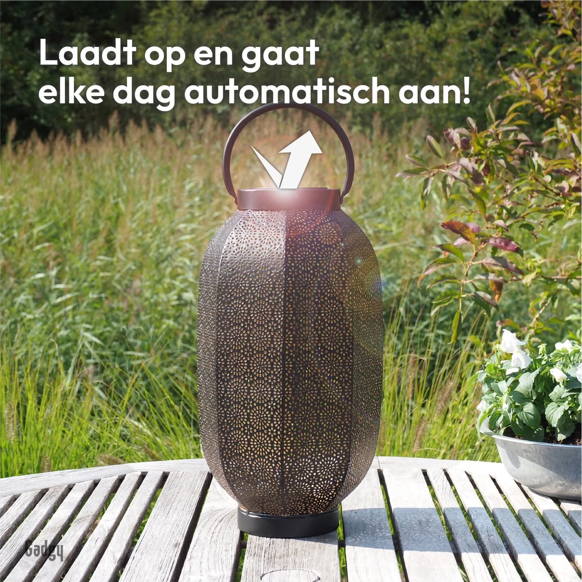 Deze mooie grote Gadgy Solar Lantaarn Bloem van wel 36 cm hoog is een eyecatcher in iedere tuin! Deze tuinverlichting is zowel overdag als ’s nachts een schitterende decoratie. De tuinlantaarn staat leuk op je terras, balkon of tuintafel. Door het uitgesneden bloemenpatroon geeft de buitenlamp een mooi warm lichteffect in het donker. Leuk voor jezelf of als cadeau voor iemand anders!