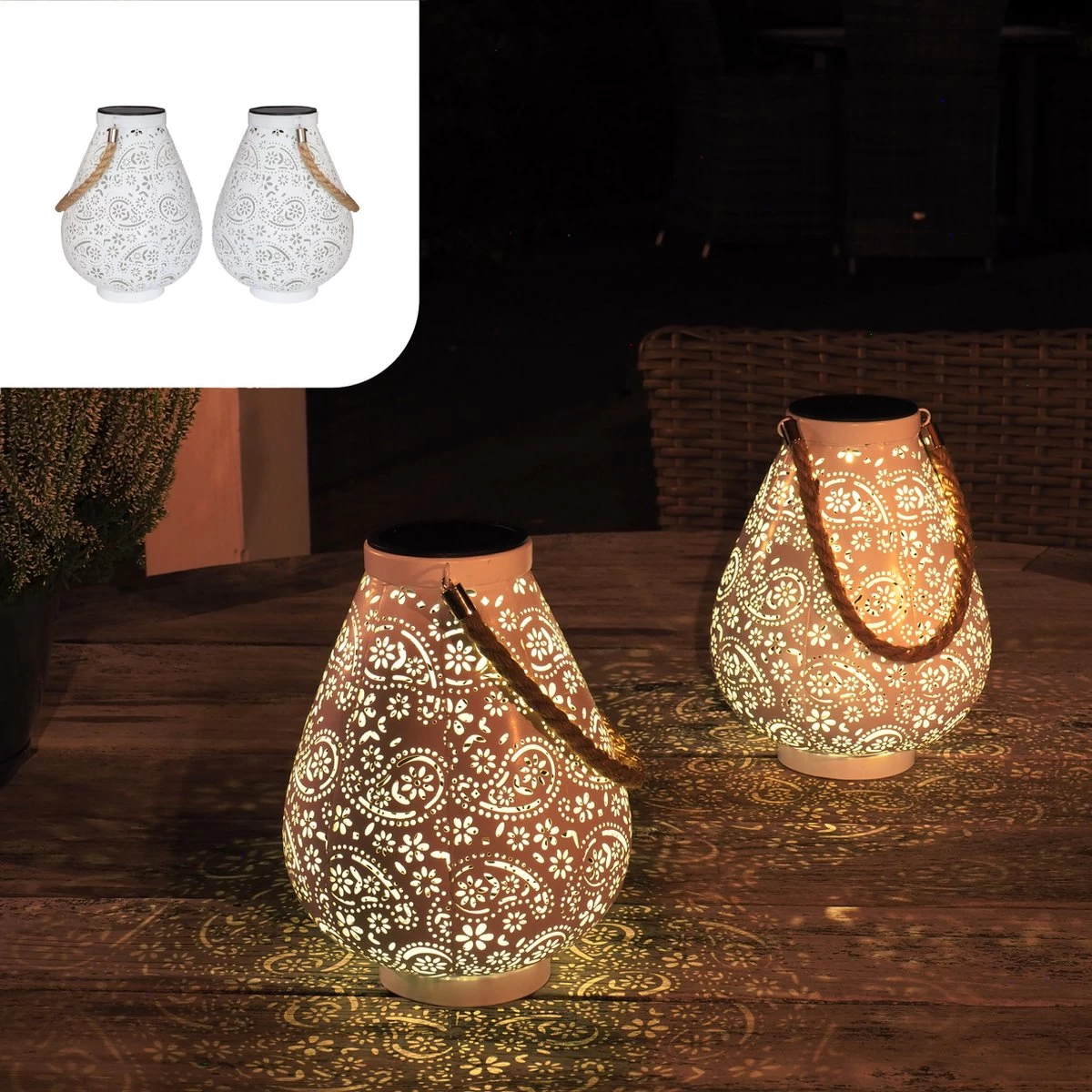 Set van 2 – Deze set bestaat uit 2 schitterende mat witte solar lantaarns voor buiten. Geschikt als tafellamp of als hanglamp door deze op te hangen aan het handvat.