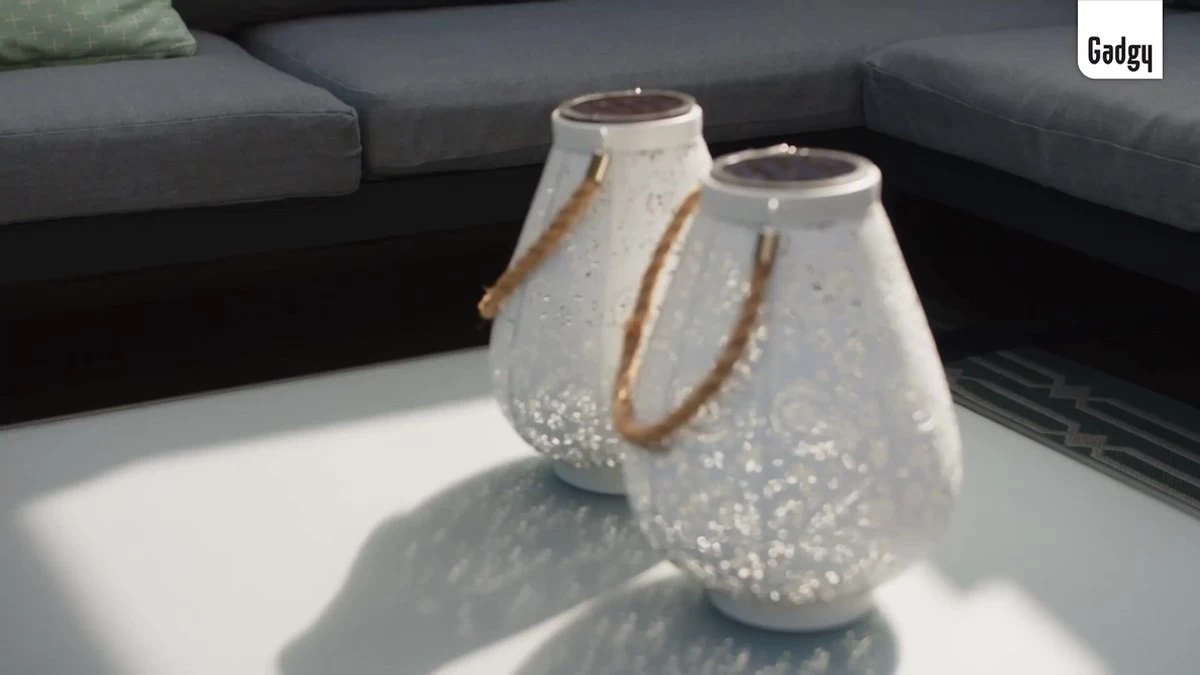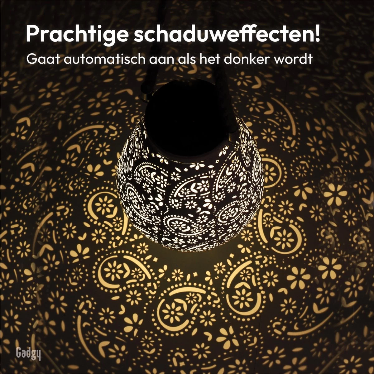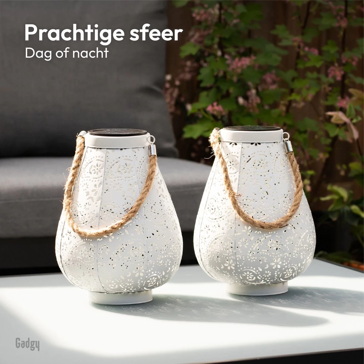 Deze set bestaat uit 2 schitterende Gadgy Solar Lantaarns voor buiten, gemaakt van stevig mat wit metaal met een handvat van touw. Deze tuinverlichting op zonne-energie is geschikt als tafellamp en ook op te hangen door middel van het handvat. Door het uitgesneden bloemenpatroon geeft de lantaarn een schitterend lichteffect in het donker. Dit maakt het de ideale decoratie voor je tuin, terras of balkon. Leuk voor jezelf of als cadeau voor iemand anders!