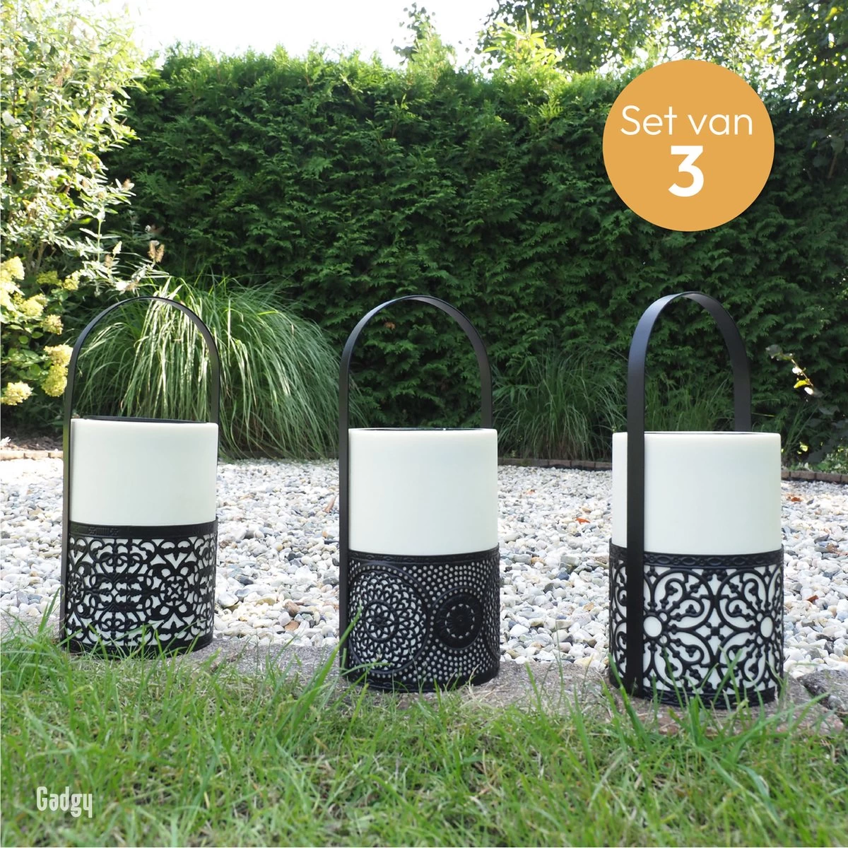 De Gadgy Solar Lantaarns zwart/wit zijn een schitterende decoratie voor je terras of tuin. Deze set bestaat uit 3 mooie lantaarns, met elk een ander ontwerp en metalen handvat. De lantaarns worden opgeladen door zonlicht, waardoor dit een duurzaam alternatief is voor lampen op batterijen en een veilig alternatief voor kaarsen. Zet eenmalig de schakelaar op ON en vervolgens gaan de lampen elke avond automatisch aan in het donker en uit zodra het licht wordt. Daarnaast zijn de lampen spatwaterdicht, waardoor je je niet druk hoeft te maken om een regenbui. Ook leuk als cadeau voor iemand anders!