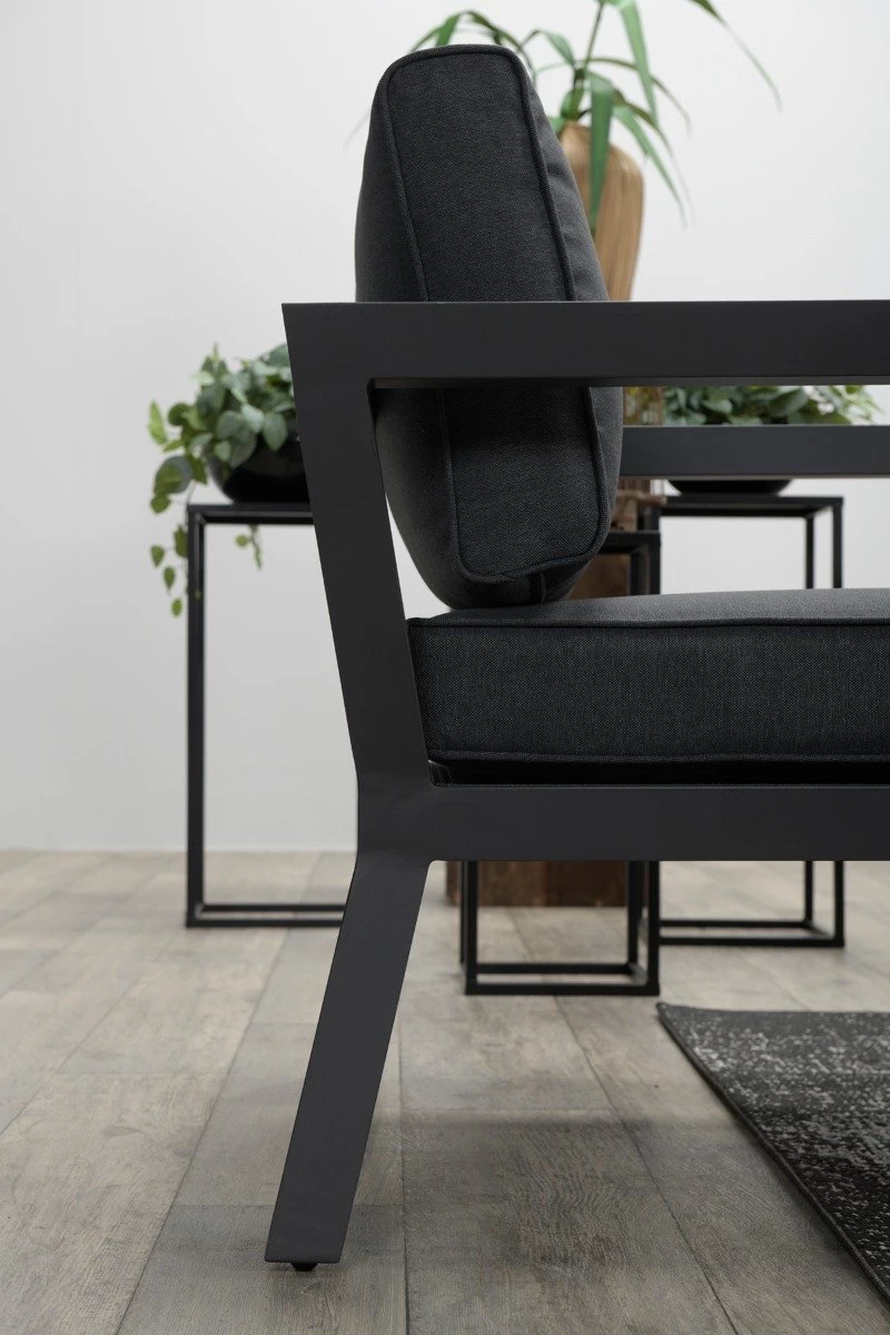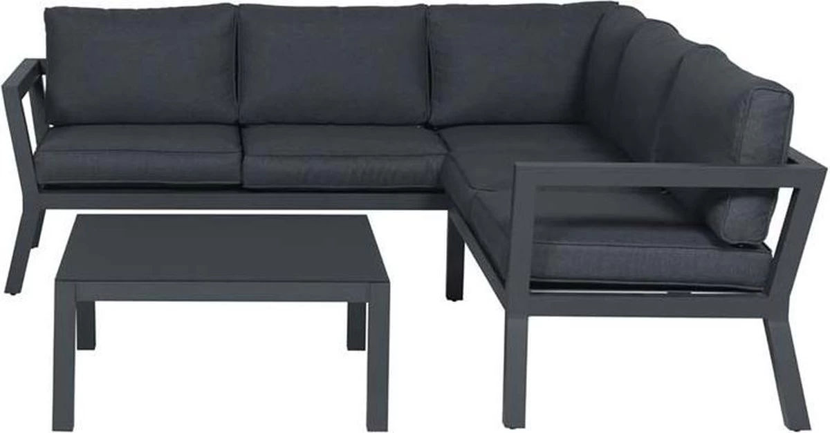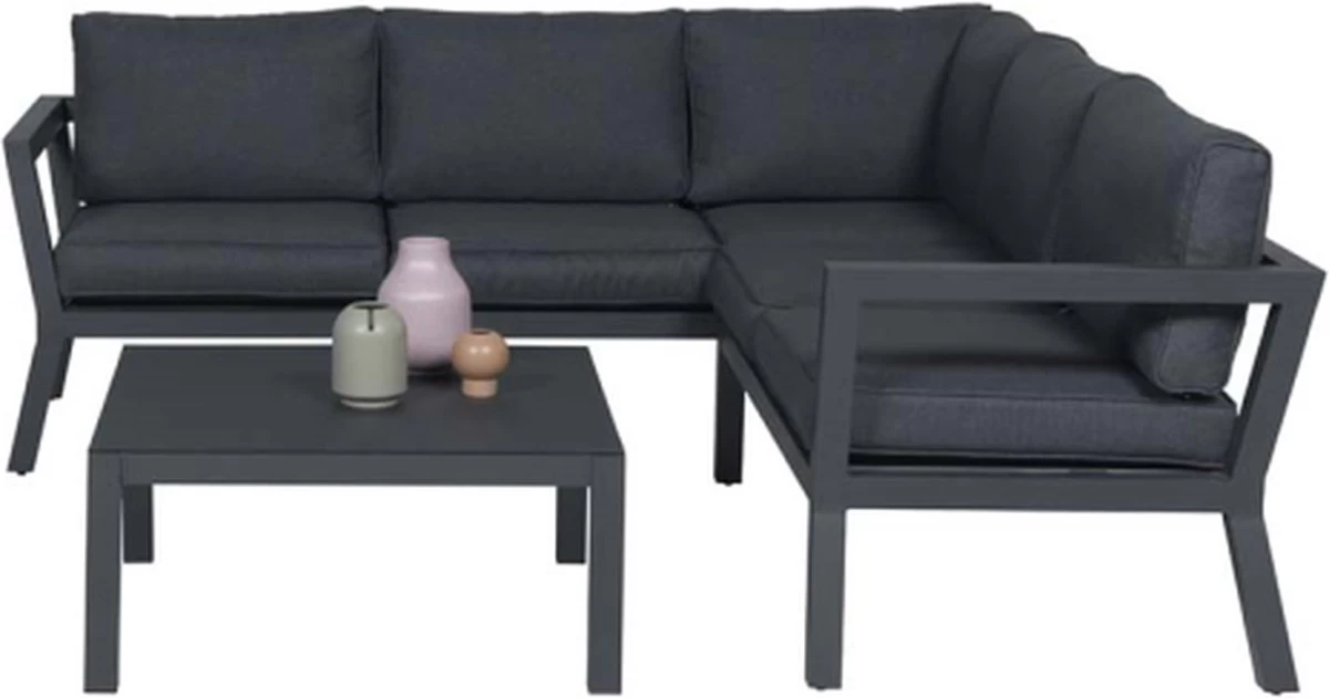 De set bestaat uit twee bankdelen en een tafel. Zowel de hoekbank als tafel hebben een aluminium frame. Hierop is een beschermende poedercoating aangebracht. Aluminium is sterk, weerbestendig en onderhoudsvriendelijk. De comfortabele loungekussens hebben een waterafstotende coating, wat er voor zorgt dat regenwater niet direct wordt opgenomen in de stof. Als de kussens niet worden gebruikt, wordt geadviseerd om deze droog op te bergen.