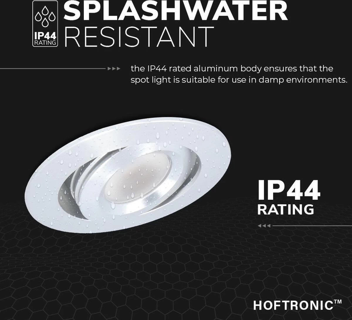 De Sienna inbouwspots zijn IP44 waterdicht. Dit betekent dat ze goed tegen vocht kunnen, maar niet in directe aanraking kunnen komen met water. Hierdoor zijn ze zeer geschikt als verandaverlichting of als verlichting van de badkamer. Ze zijn hierdoor niet geschikt als grondspot of wandspot.