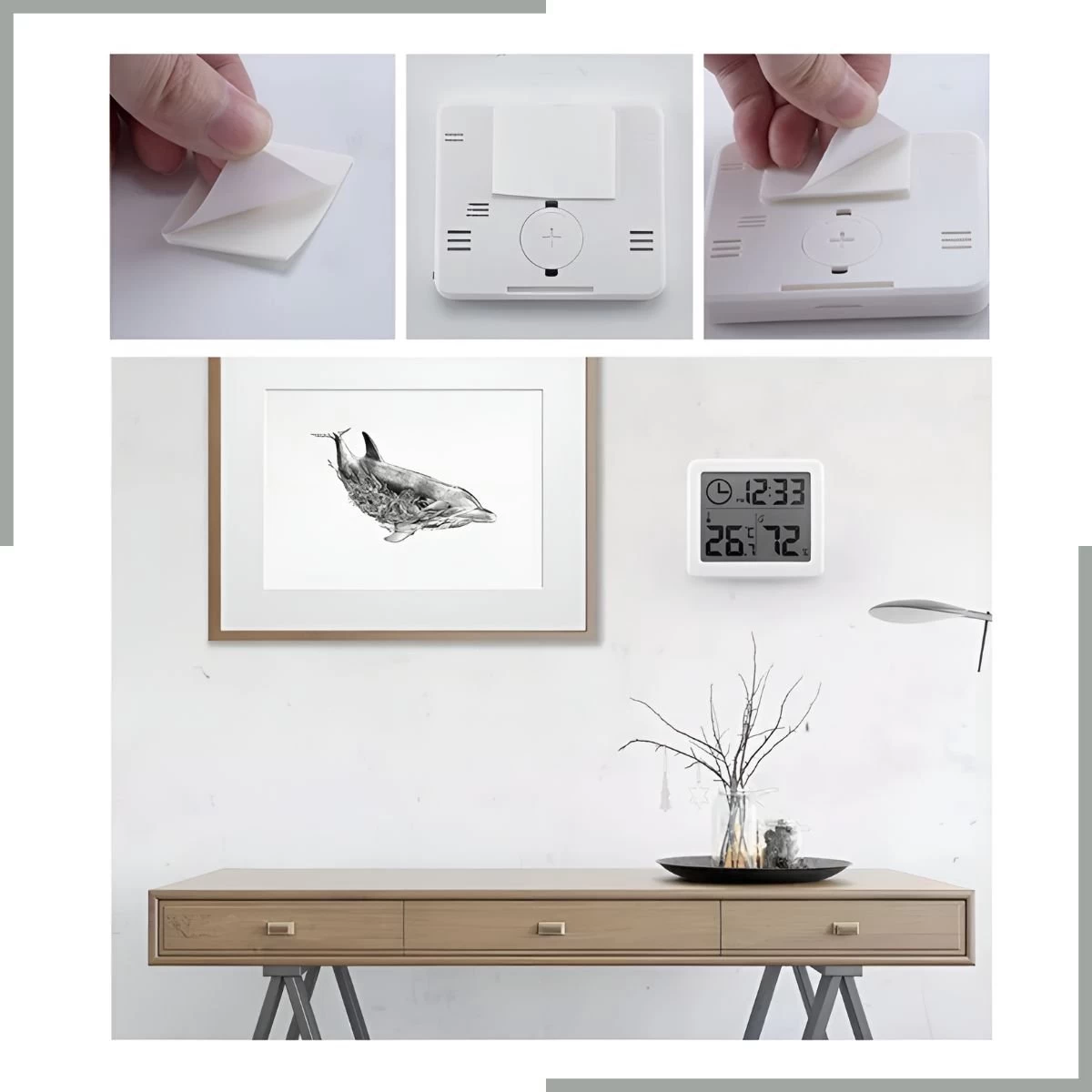 De hygrometer is op twee manieren te plaatsen in huis. Met de sticker op de achterkant is het erg gemakkelijk om het product aan de muur op te hangen. Met de standaard in het product zet je het station gemakkelijk op de vensterbank of naast je bed.