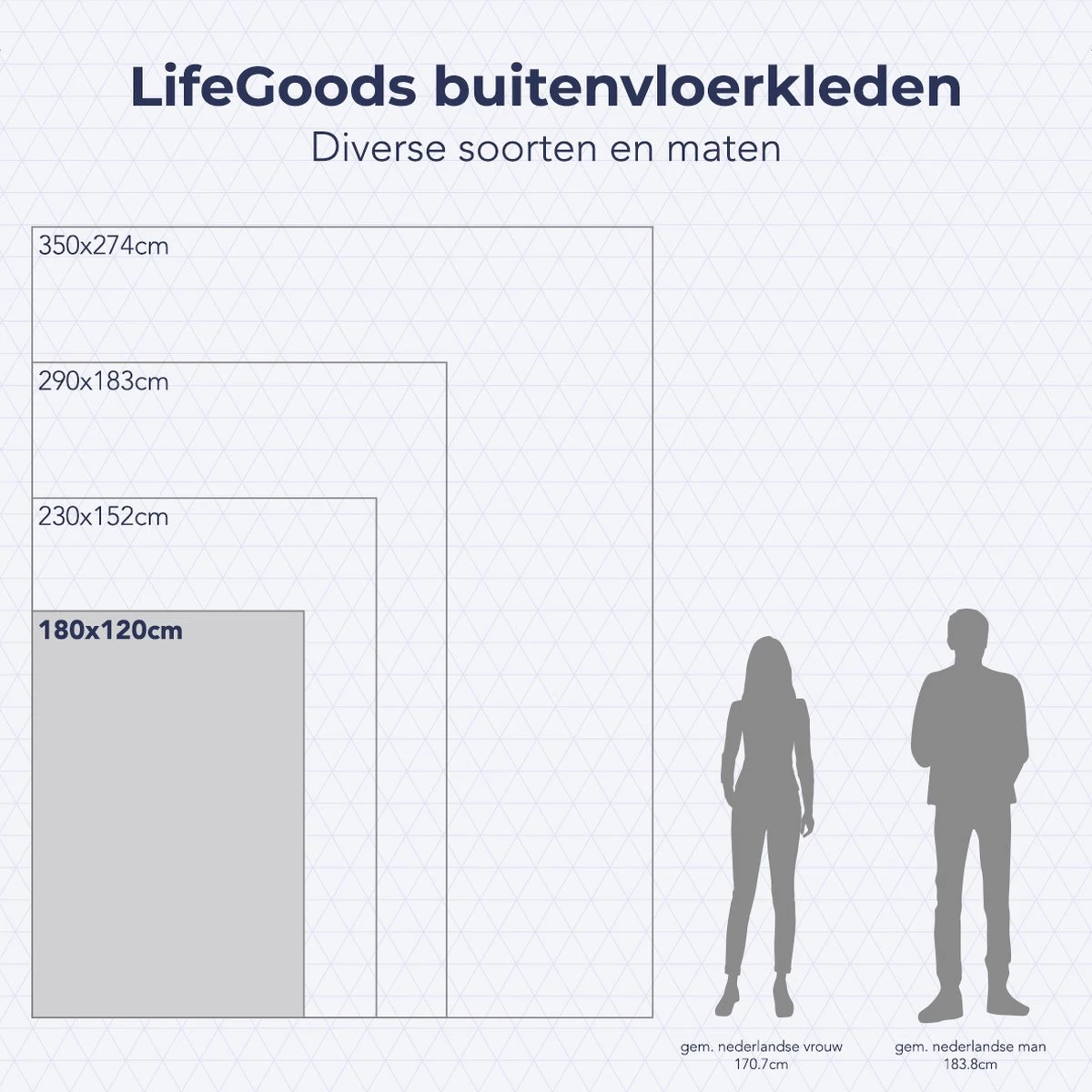 Op zoek naar een veelzijdig buiten vloerkleed? Kijk dan niet verder! Het buitentapijt van LifeGoods is voorzien van een speels patroon en voegt net dat beetje extra toe aan jouw buitenruimte! Het beste van alles? Je kunt het tuintapijt omdraaien waardoor je de kleuren van het patroon andersom ziet. Het buiten vloerkleed heeft een afmeting van 120 × 180 cm en is voor buiten. Het is perfect voor het opleuken van je veranda, patio, tuin of balkon en ook ideaal voor op camping of tijdens een picknick in het park!