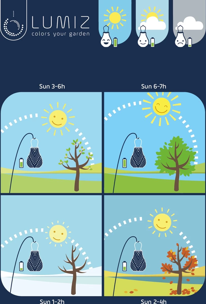 • In de zomer schijnt de zon vaker en langer, waardoor de lampion meer energie kan opnemen en dus langer kan branden dan in de andere seizoenen. Op zonnige winterdagen zal de LUMIZ ook kunnen branden, weliswaar staat de zon lager en zullen de branduren wat minder zijn.