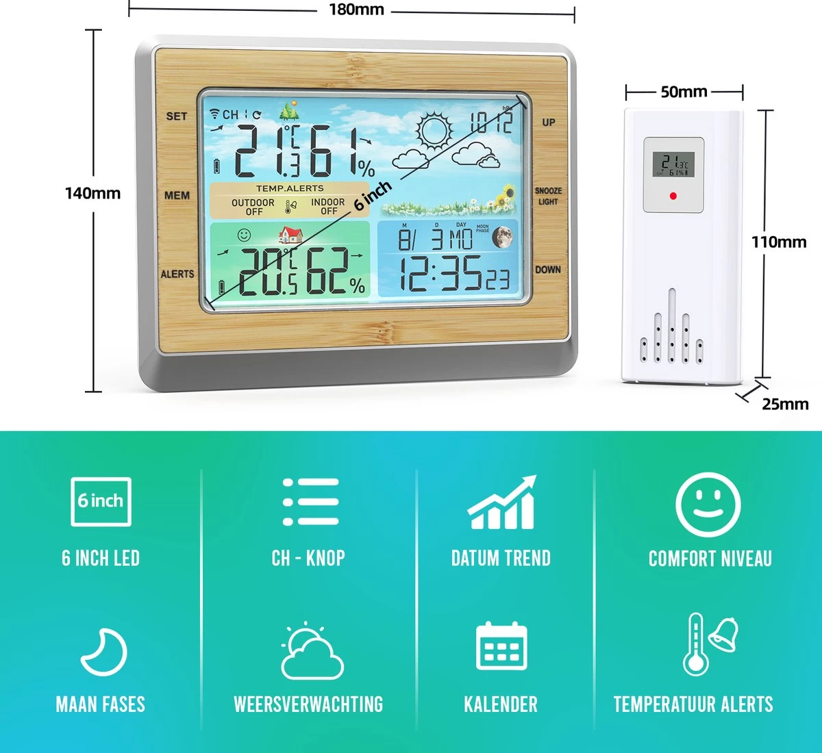 -Binnen- en buiten weerstation met groot 6 inch kleurenscherm en achtergrondverlichting.