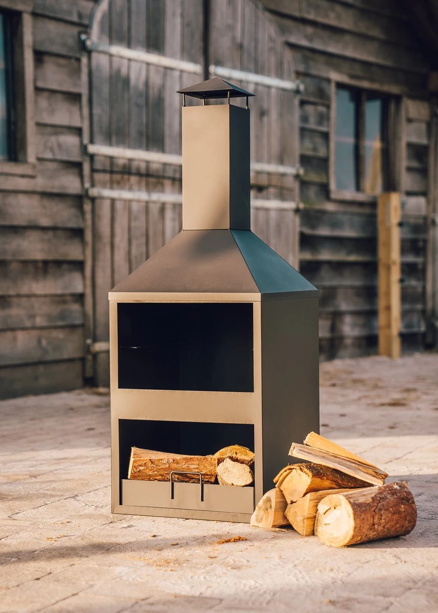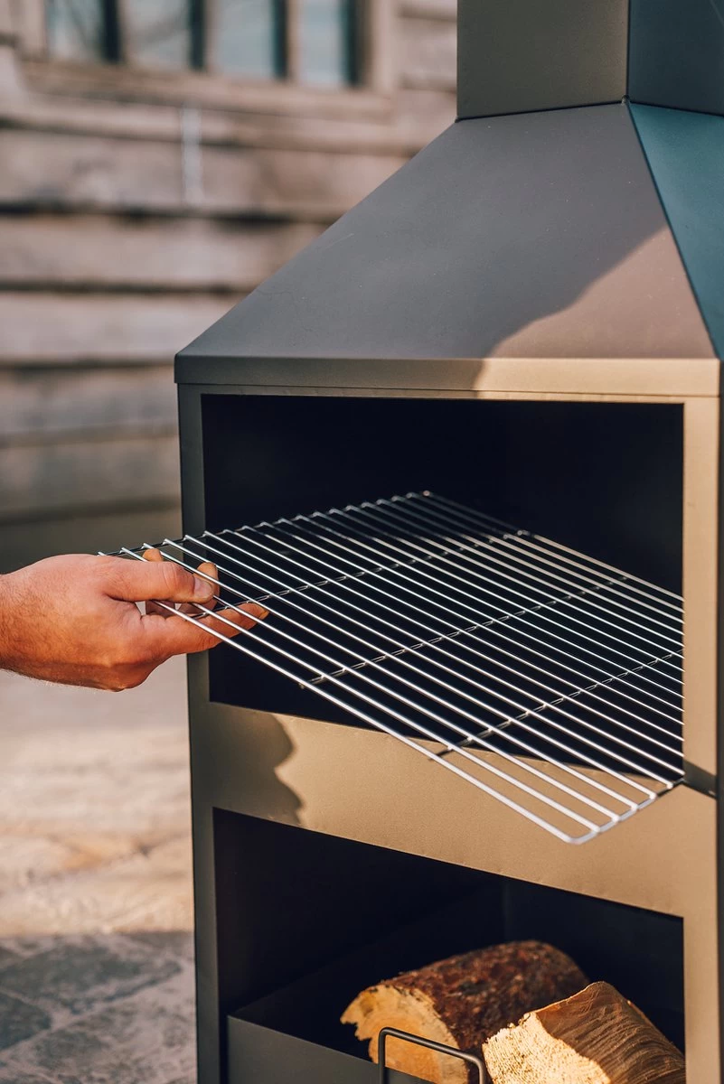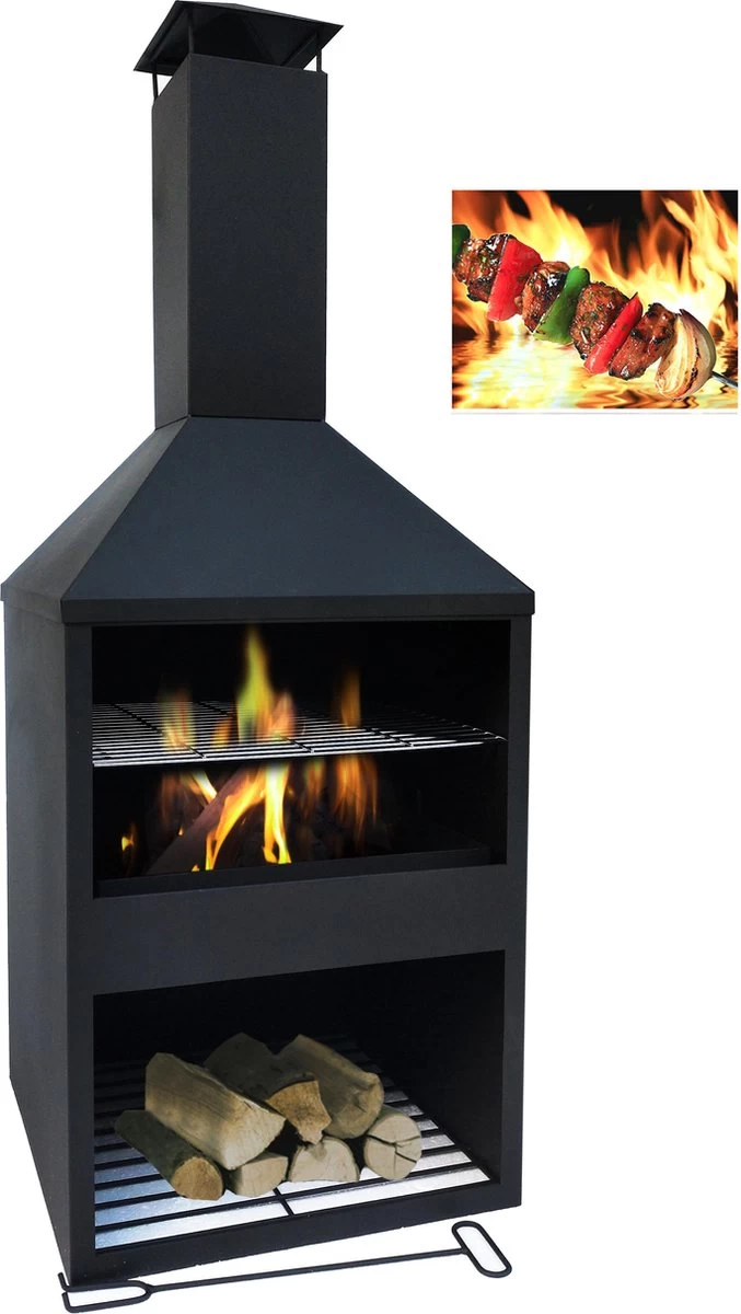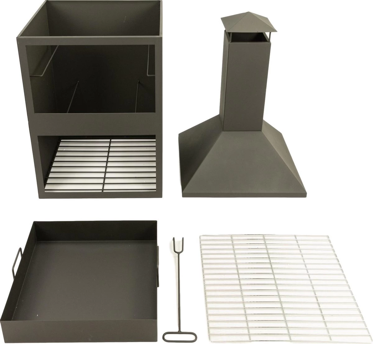 De schoorsteen zorgt ervoor dat de rook perfect wordt afgevoerd en is voorzien van een regenkap waardoor inregenen voorkomen wordt. Door de uitneembare asopvangbak verwijder je heel eenvoudig as- en houtresten.