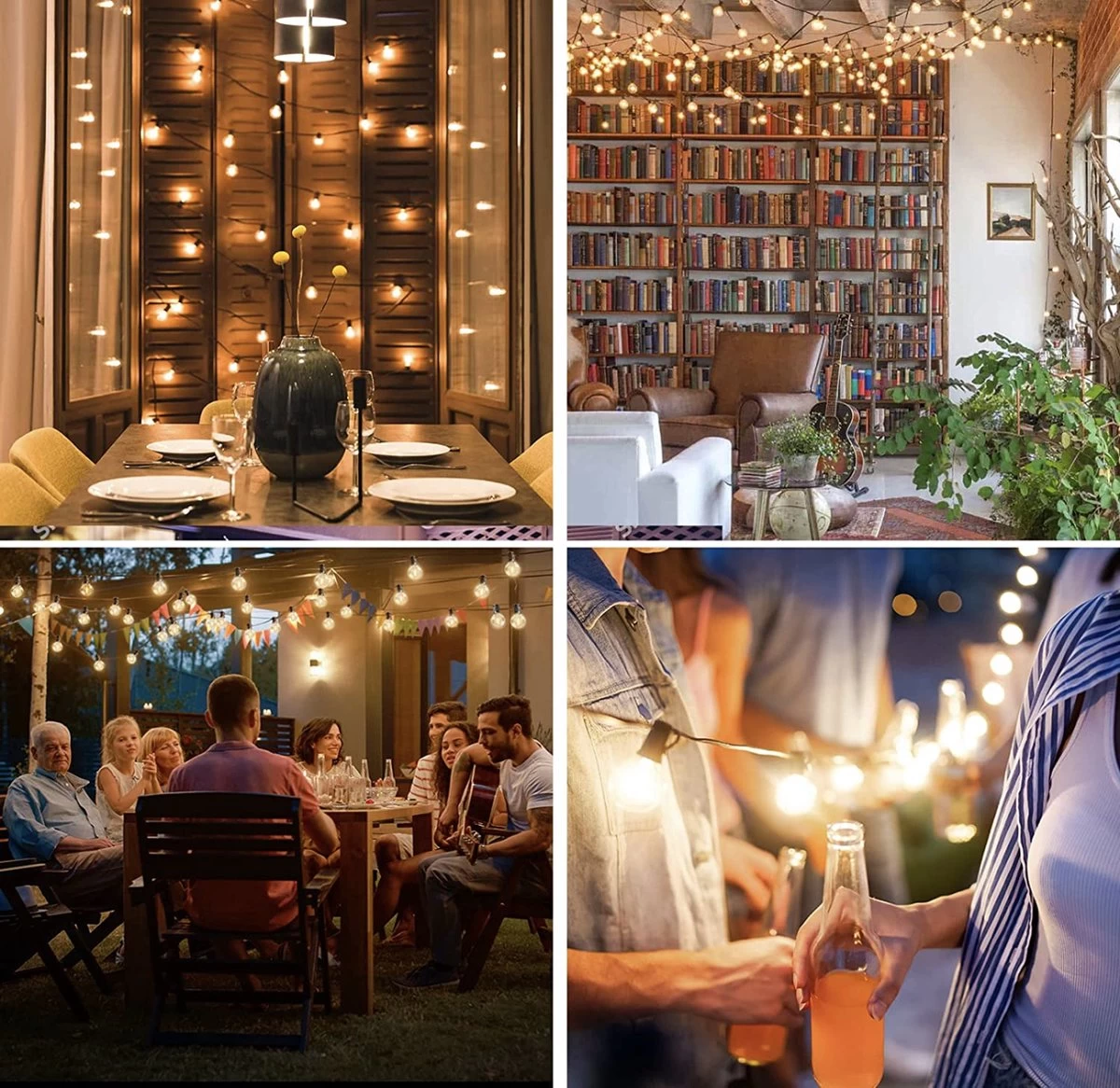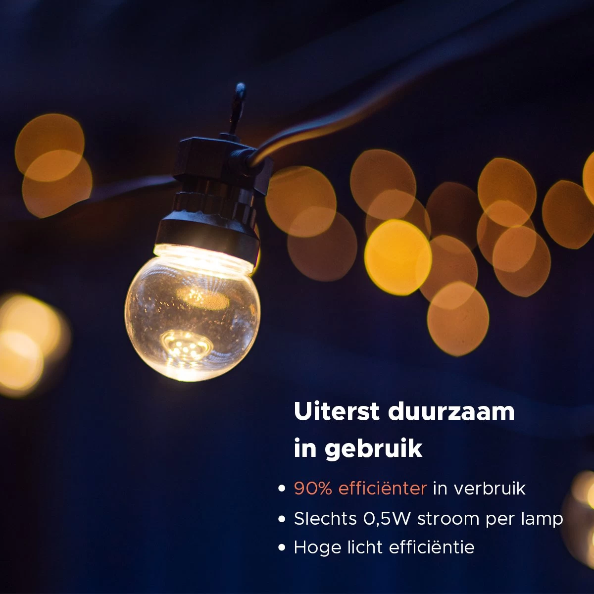 Energiebesparing – Buitenlichtslingers bevatten 25 transparante 2 PIN G40-lampen en 4 reservelampen. Elke snaar van 12,5W kan een helderheid van 25W krijgen en de levensduur van de lamp is 30000 uur. Onze lichtslingers voor buiten zijn 90% energiezuiniger dan gloeilampen, waardoor je beter af bent van een dure elektriciteitsrekeningen dan van traditionele lampen.