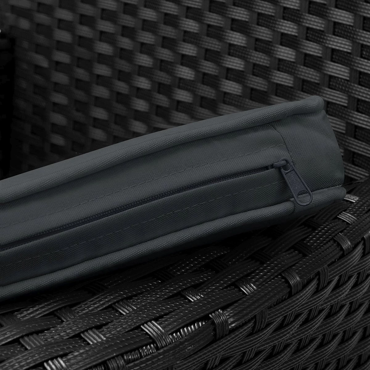Met het materiaal polyrotan ben je helemaal on trend. Het hoogwaardige gevlochten materiaal wordt steeds populairder en overtuigt met tal van positieve eigenschappen. De synthetische vezel trotseert weer en wind en is ideaal voor gebruik op je terras of in de tuin. De unieke rotan-look in zwart met grijze kussens geeft je nieuwe loungemeubel een moderne charme. Geniet van warme zomeravonden in ontspannen samenzijn met een glas rode wijn op je balkon.
