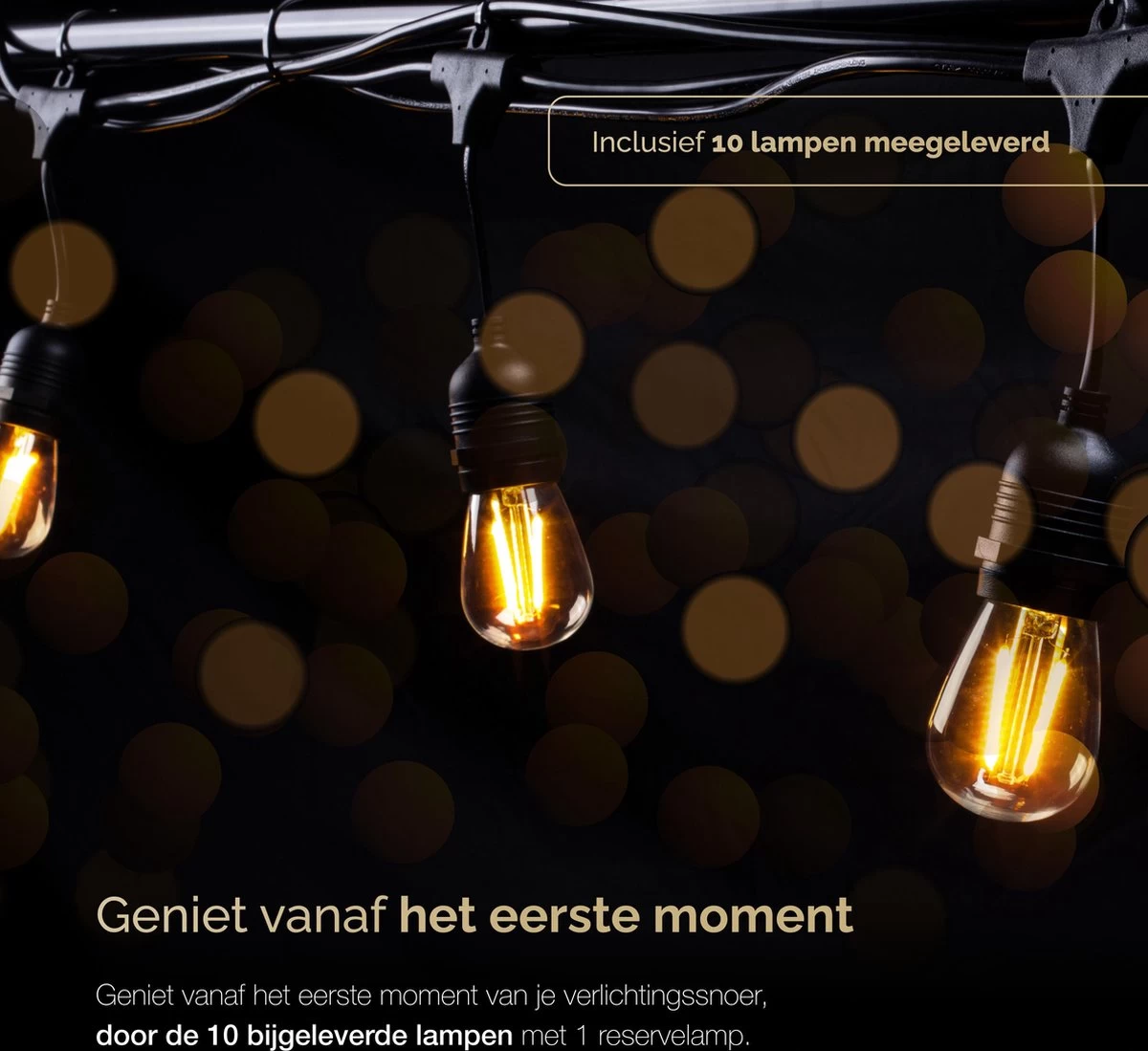 ✔ 10 lampen inbegrepen – Vermijd lange wachtrijen in de doe-het-zelfzaak. Wij leveren namelijk 10 lampen mee én zelfs nog een reserve lamp zodat jij na het uitpakken al meteen plezier kunt hebben van jouw nieuwe lichtsnoer.