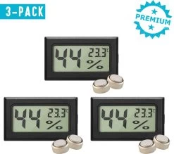Je ontvangt een stevige doos waarin de 3 x hygrometer/thermometer met batterij en 1 x 2 extra LR44 batterijen goed verpakt zijn.