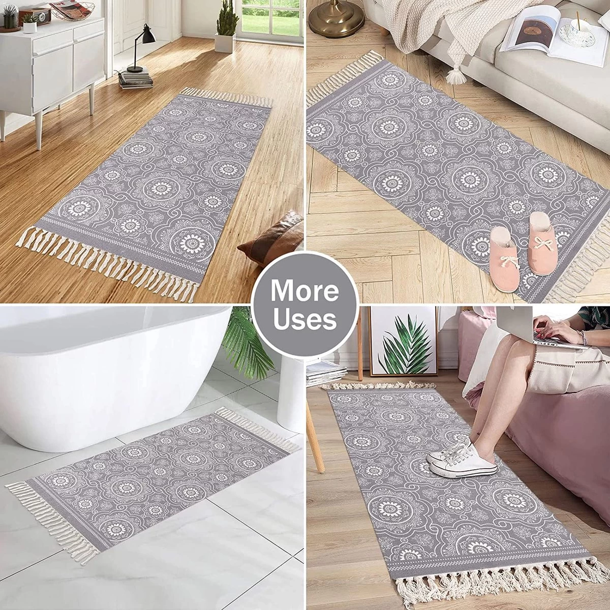 SHACOS Katoenen Tapijt, Loper Voor Keuken, Hal, Handgeweven Boho Karpet, Wasbare Bedrukte Karpetten Voor Binnen Met Kwastjes, Vintage Loper Voor Woonkamer, Slaapkamer, Wasruimte (grijs, 60×90 Cm)