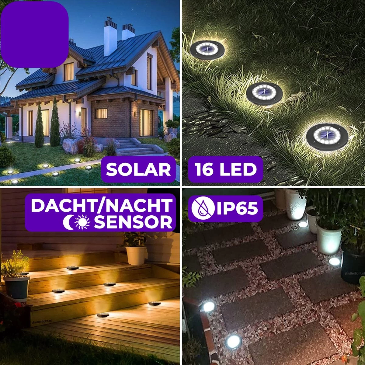 Altijd gezellige licht in de donker en zonder op te laden? De Shutterlight Solar Grondspots zijn de oplossing! De grondspots gaan automatisch aan/uit en werken op zonne-energie. Zo kan je zorgeloos genieten van de gezellige verlichting en het is gemakkelijk te installeren binnen 1 minuut. Het is water, sneeuw en storm bestendig, geschikt voor alle seizoenen. Kijk niet verder en bestel vandaag nog de Shutterlight Grondspots!