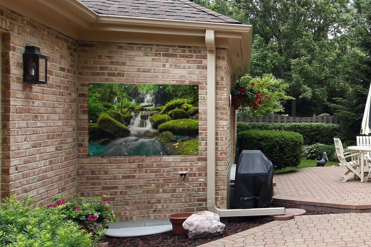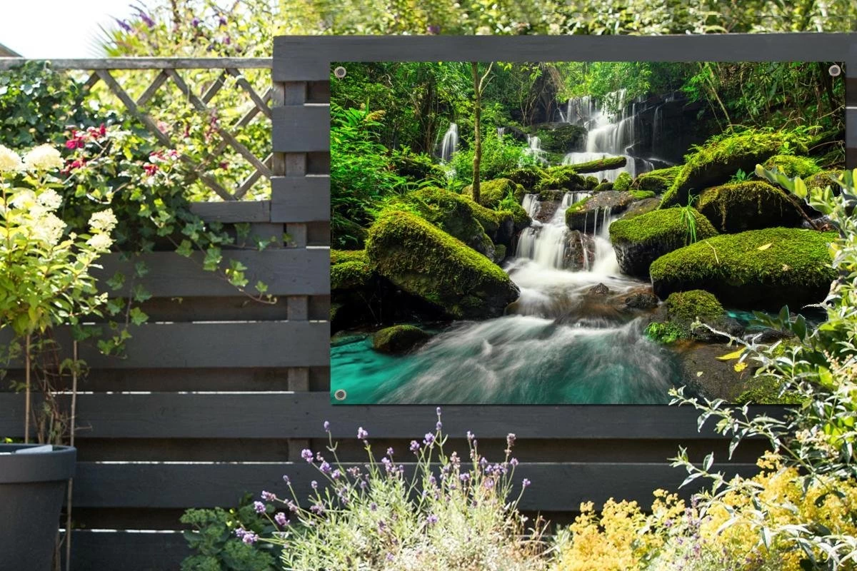 De water val op deze tuinposter betreft een tropische waterval in het midden van de jungle van Thailand. Het doek dat prima buiten kan hangen in alle weersomstandigheden is voorzien van ringen waardoor het eenvoudig is op te hangen