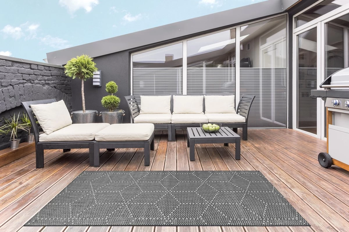 Geef je woonkamer, veranda, balkon of terras een trendy look. Ons vloerkleed POGO is een echte blikvanger met zijn stijlvolle patronen en kleuren. Dit vloerkleed is weersbestendig en kan dus zowel binnen als buiten gebruikt worden.
