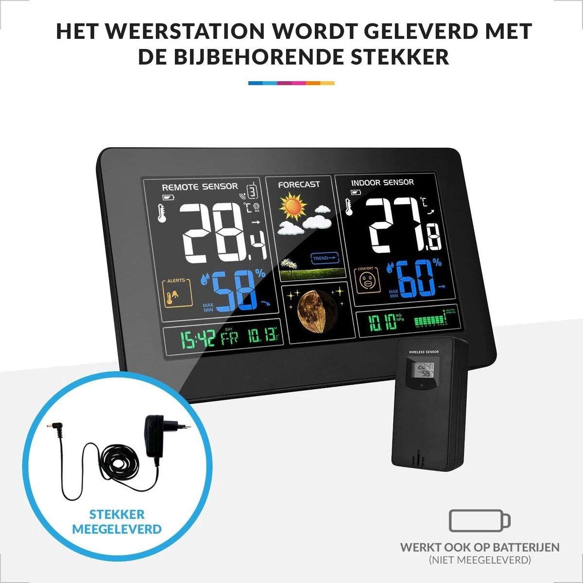 Het weerstation is makkelijk in te stellen met behulp van de bijgevoegde Nederlandse handleiding. Zodra het weerstation is aangesloten op het netstroom (aanbevolen) of de batterijen zijn geplaatst stelt het toestel zichzelf volledig automatisch in en hoef je enkel de juiste tijdzone nog te kiezen. U kunt het weerstation overal in huis plaatsen, dankzij de uitklapbare standaard of makkelijk aan de wand ophangen, net zoals de buitensensor.
