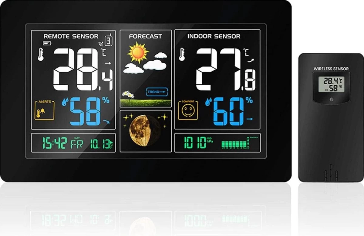 Het draadloze weerstation met buitensensor, thermometer, hygrometer geeft een nauwkeurige en betrouwbare meting van de binnen – en buiten temperatuur, de luchtdruk en luchtvochtigheid. U krijgt bovendien een idee van het comfortniveau, dat wordt weergegeven door middel van 5 symbolen. Het weerstation berekent een voorspelling voor de komende 12 uur op basis van de ontwikkeling van de luchtdruk. Let op! Wanneer het weerstation binnen staat kan het zijn dat de weersvoorspelling niet helemaal accuraat is.